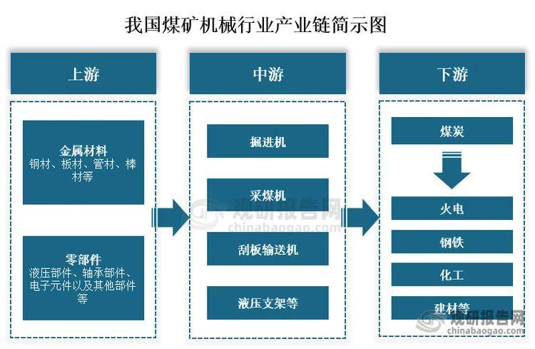从财产链来看,煤矿机械上逛次要为金属材料、零部件,此中金属材料上逛次要为钢材、板材、管材、棒材等,零部件包罗液压部件、轴承部件、电子元件以及其他部件等;中逛为煤矿机械出产制制;下逛次要使用于煤炭行业,进一步用于火电、钢铁、化工、建材等范畴。